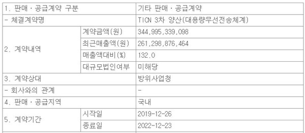 계약금액은 정정전 3404억원에서 3450억원으로 변경됐다. 계약물량 증가에 따라 계약금액을 증액해서다. 매출액 대비 132% 규모이며, 계약기간은 내년 12월 23일까지다.