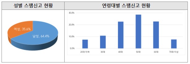 분석 결과, 성별 스팸신고 비율은 남성 64.4%, 여성 35.6%로 남성이 여성에 비해 약 1.8배 높았으며, 연령대별로는 50대 28.6%, 60대 22.8%, 40대 22.7% 순으로 높은 비율을 차지했다.