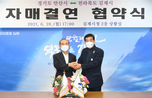 경기 안산시는 전북 김제시와 자매결연 협약을 체결하고 두 도시의 공동번영과 상호교류를 통한 상생발전을 위해 협력하기로 했다고 밝혔다.