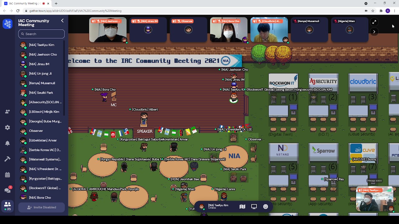 특히 이번 운영자회의는 메타버스 방식의 새로운 시도와 더불어 공공기관 최초로 게더타운 내에 가상의 기업 홍보부스를 구축해 해외 진출을 희망하는 다양한 분야(인공지능, 핀테크, 디지털트윈, 정보보안 등)의 12개 기업이 IAC) 운영자들 대상으로 자사 개발 ICT 서비스를 소개하고 협력방안을 논의하는 시간을 가졌다.
