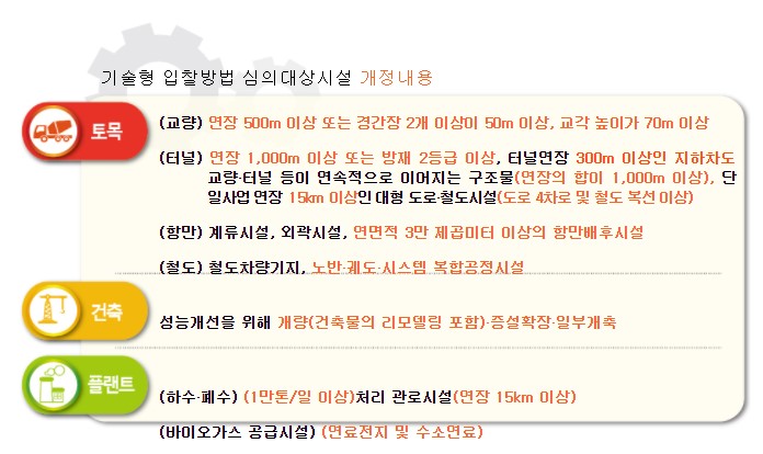 건축 리모델링, 토목·건축 분야 건축물의 성능보수나 개량사업, 연료전지와 수소연료와 같은 바이오가스 공급시설도 기술형 입찰로 발주할 수 있게 된다.