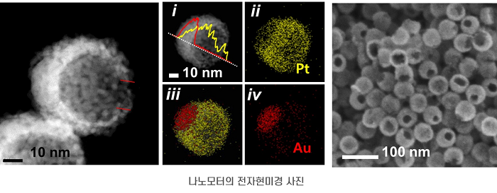 연구팀은 둥지 내 달걀(egg-in-nest) 형태와 유사한 금-백금(Au-Pt) 기반 나노 구조를 도입하고, 나노입자 내부의 동적 움직임을 제한하는 방식을 통해 다중 촉매 기능을 가진 나노모터를 용액 내에서 합성했다. 합성된 나노모터는 촉매 Au-Pt 인터페이스가 비대칭적으로 끝에 위치한 독특한 야누스 나노 구조를 가졌다. 이 독특한 야누스 나노 구조로 인해 나노모터는 포도당을 연료로 사용해 브라운 운동을 극복하고 방향성 움직임을 보였다.