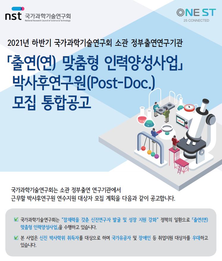 국가과학기술연구회(이하 NST)는 과학기술분야 정부출연연구기관(이하 출연연)에서 박사후연구원으로 현장 R&D 연수를 지원하는 2021년 출연연 맞춤형 인력양성사업의 하반기 박사후연구원 채용을 시작한다고 밝혔다.