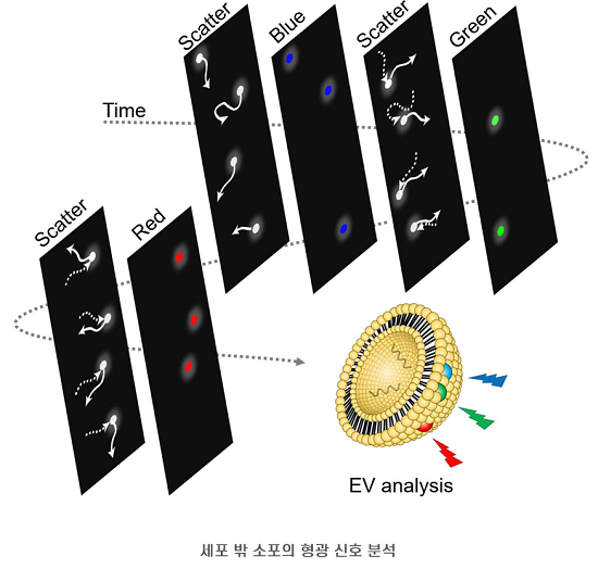 연구팀은 개별 세포 밖 소포의 크기와 단백질 발현의 특성화를 위한 형광 기반 나노 입자 추적 분석(NTA) 시스템을 구축했다. 이 시스템을 통해 4개의 서로 다른 파장을 가진 레이저 시트를 프로그래밍 된 순서에 따라 세포 밖 소포에 순차적 조광해 산란광 신호 이미지와 형광 신호 이미지를 얻었다. 영상을 통해 관측된 수천 개에 달하는 개별 입자의 크기, 존재 비율, 산란광 밝기 등을 관찰하고, 3가지의 서로 다른 형광 밝기로 구성된 6차원 값을 얻을 수 있었다.