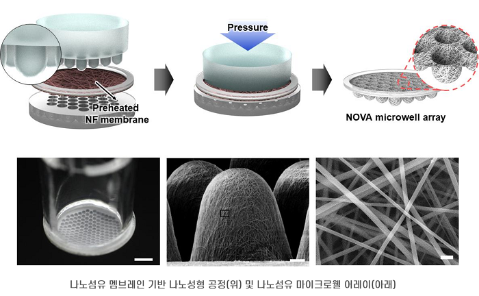 기존 스페로이드 배양 플랫폼의 한계를 극복하고자 연구팀은 전기방사법으로 제작된 나노섬유 멤브레인을 3차원으로 가공할 수 있는 나노성형 공정을 새로이 개발했다. 연구팀은 개발된 나노성형 기술을 기반으로 크기, 종횡비, 웰 밀도 제어가 가능한 타원형 구조의 나노섬유 마이크로웰 어레이를 제작함으로써 스페로이드들을 세포 손실 없이 균일하고 안정적인 방식으로 형성하는데 성공했다.