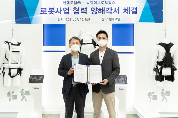 [테크월드뉴스=방제일 기자] 국내 최대 로봇 자동화 AI 추천 서비스 마로솔을 운영하는 빅웨이브로보틱스(이하 빅웨이브)는 16일 국내 웨어러블 로봇 선도기업 현대로템과 ‘웨어러블 로봇 보급 확산을 위한 업무협약’을 맺었다고 밝혔다.