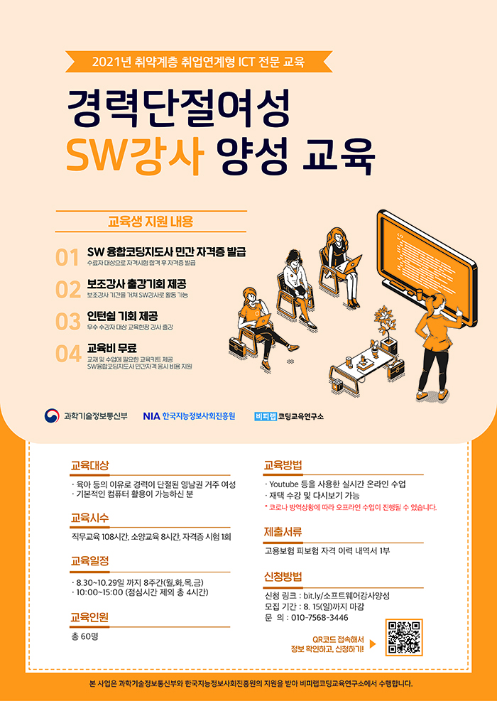 해당 수업은 육아 등의 이유로 경력이 단절된 영남권 거주 여성이라면 누구나 지원 가능하며, 총 60명의 신입생이 SW강사가 되기 위한 교육과정을 온라인 비대면 강의를 통해 들을 수 있다. 온라인 강의 특성상 수강 중 진도를 놓치게 돼도 온라인 다시보기가 제공돼 시간에 구애받지 않고 수료가 가능한 점이 취업소외계층에게 각광을 받고있다.