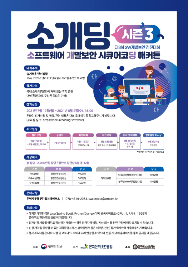행정안전부(이하 행안부)와 한국인터넷진흥원은 8월 11일부터 8월 27일까지 전국 대학생·대학원생을 대상으로 ‘제8회 소프트웨어 개발보안 경진대회’를 개최한다고 밝혔다.