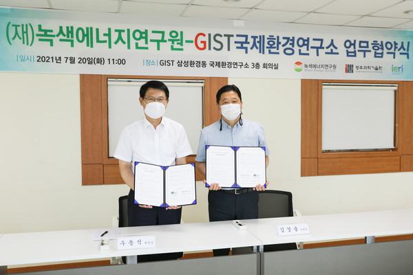 이날 협약식에는 국제환경연구소 김경웅 소장과 (재)녹색에너지연구원 주동식 원장이 참석한 가운데 지스트 국제환경연구소에서 진행됐다.
