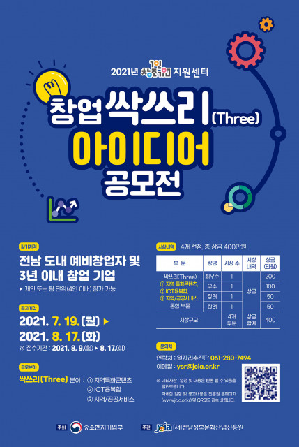 [테크월드뉴스=방제일 기자] 전남정보문화산업진흥원(이하 ‘진흥원’)이 지역 창업기업 창작 의욕 고취와 ICT·콘텐츠 산업 분야 활성화를 위해 ‘2021년 1인 창조기업 싹쓰리(Three) 아이디어 공모전’을 개최한다고 밝혔다.