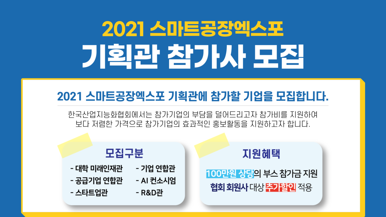 한국산업지능화협회(구 한국스마트제조산업협회)가 오는 9월 8일부터 10일까지 열리는 ‘2021 스마트공장엑스포’ 기획관에 참여할 기업을 모집 중이라고 밝혔다.