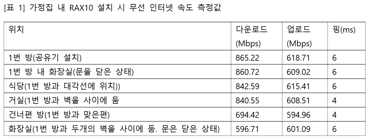 ‘인터넷 속도’ 메뉴에선 통신 속도를 측정할 수 있다. 여기에서 속도를 측정해보면 보급형 엔트리급 공유기임에도 상당한 속도가 나옴을 알 수 있다. [표 1]은 필자의 집 안 내부에서 RAX10을 설치한 후 스마트폰으로 각 위치별 속도를 측정한 값이다. 모 통신사의 기가 인터넷(1Gbps)을 사용하고 있는데, 대체로 만족할 만한 수준으로 측정되는 것을 확인할 수 있다. 또한, 한국지능정보사회진흥원(NIA) 사이트에서 유선 인터넷 속도를 측정한 결과는 다운로드 963.16Mbps, 업로드 973.91Mbps, 지연시간(핑) 1.88ms로 나타났다.