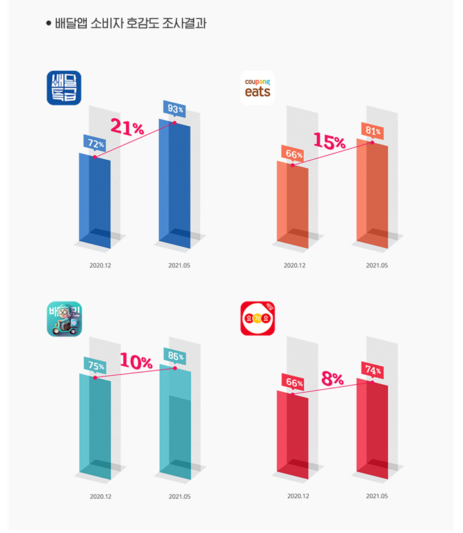 배달특급의 긍정적인 효과를 입증한 것은 이번 조사뿐만이 아니다. 지난 7월 5일 또 다른 온라인 전문 조사 기관 차이커뮤니케이션이 발표한 자료에 따르면, 2020년 12월부터 2021년 5월 31일까지의 호감도 분석 결과 배달특급이 호감도 72%에서 93%로 가파르게 상승하며 1위를 차지한 것으로 나타나기도 했다.