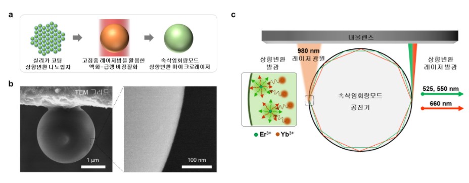 김동환 교수는 “본 연구는 기존에 널리 사용돼온 결정질 구조의 상향변환 재료의 고정관념을 벗어나 재료의 무질서 구조를 적극적으로 활용함으로써 마이크로레이저의 소형화뿐만 아니라 효율성 한계까지 극복한 최초의 사례이며, 향후 제조 공정 자동화·집적화를 통해 활용성을 극대화할 수 있을 것으로 기대한다”고 연구 의의를 밝혔다.