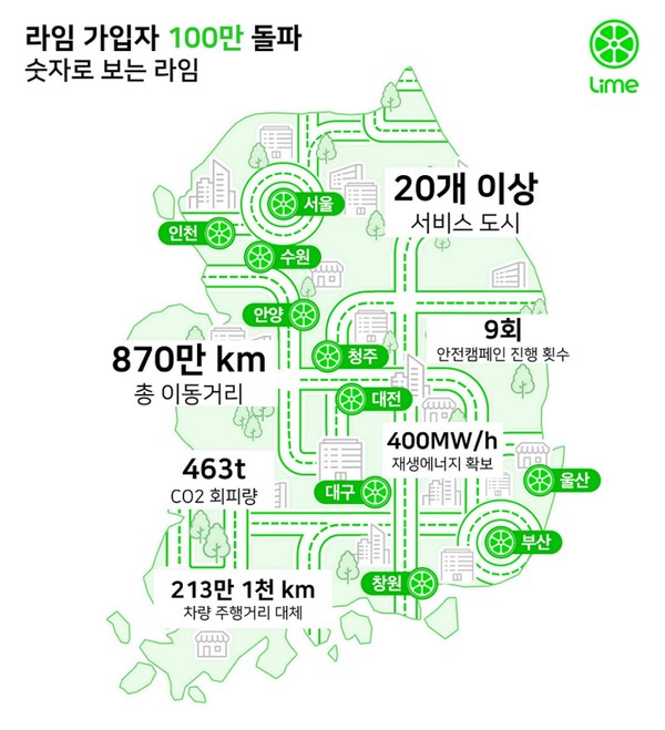 [테크월드뉴스=방제일 기자] 공유 킥보드 ‘라임(Lime)’이 2019년 10월 서비스 출시 이후 약 21개월 만에 국내 누적 가입자 총 100만 명을 돌파했다고 밝혔다.