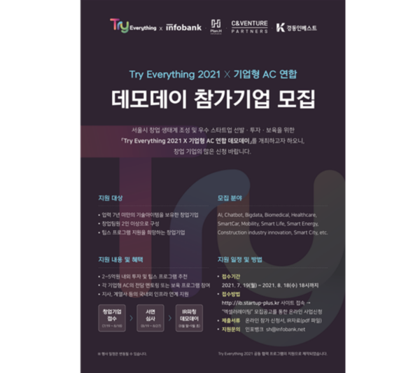 [테크월드뉴스=방제일 기자] 인포뱅크 아이엑셀에서 ‘Try Everything 2021 X 기업형 AC 연합 데모데이’에 참가할 창업기업을 모집한다.