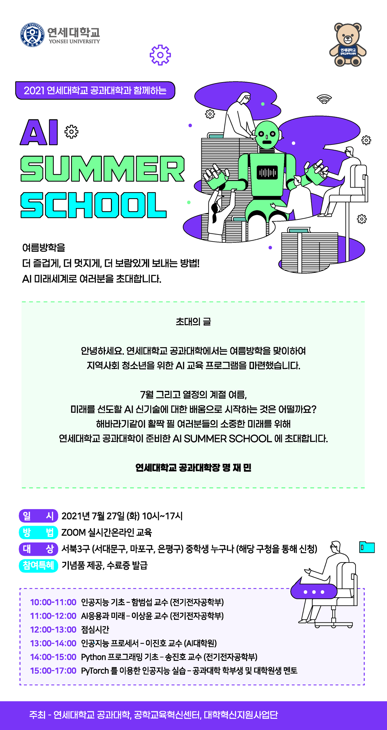 연세대학교 공과대학과 공학교육혁신센터는 7월 27일 지역 청소년을 대상으로 ‘2021 연세대학교 공과대학과 함께하는 AI Summer School’을 개최했다.
