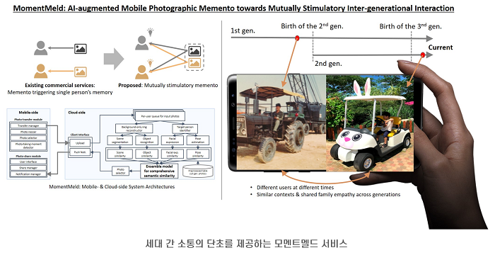 공동 연구팀이 개발한 모멘트멜드는 노년 세대와 자녀 세대가 삶의 절대적인 시간대는 다를지라도 비슷한 맥락을 공유하고 있다는 점을 착안, 우리 일상에서 반복적으로 스쳐 가는 단편적 순간들을 포착해 세대 간 양방향 소통의 단초를 제공해주는 AI 기반 모바일-클라우드 복합 서비스이다.