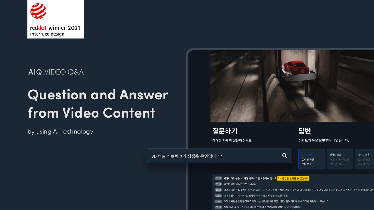 AIQ.VIDEO Q&A는 이번 레드닷 디자인 어워드에서 AI를 통해 단순히 결과가 ‘무엇’인지에만 초점을 맞추는 것이 아니라 ‘왜’ 그 결과인지를 전달할 수 있는 ‘설명 가능한’ UX(User Experience, 사용자 경험)를 구현한 점이 높은 평가를 받았다. 인터넷 강의, 제품 리뷰, 자동차 시승기 등의 예시를 통해 어떤 식으로 활용하면 좋을지를 미리 살펴보고, 일상에서 사용하는 자연스러운 언어로 사람에게 질문하듯 궁금한 점을 입력해 답변을 확인하는 사용자 플로우를 도입했다.