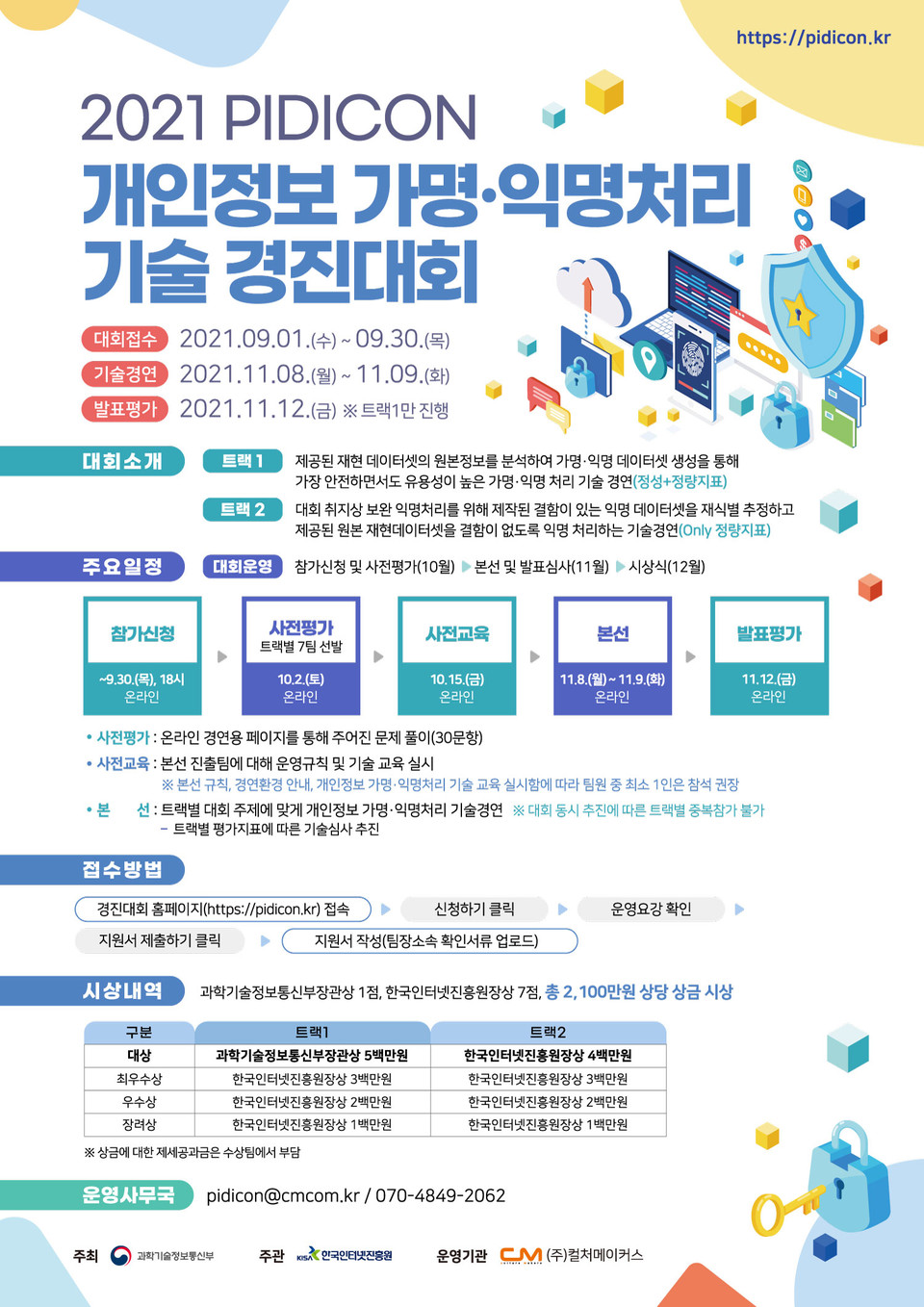 [테크월드뉴스=조명의 기자] 한국인터넷진흥원(이하 KISA)과 과학기술정보통신부는 가명·익명처리에 대한 인식 제고와 전문인력 양성을 위한 ‘2021년 가명·익명처리 기술 경진대회’를 오는 10월부터 온라인으로 개최한다고 밝혔다.