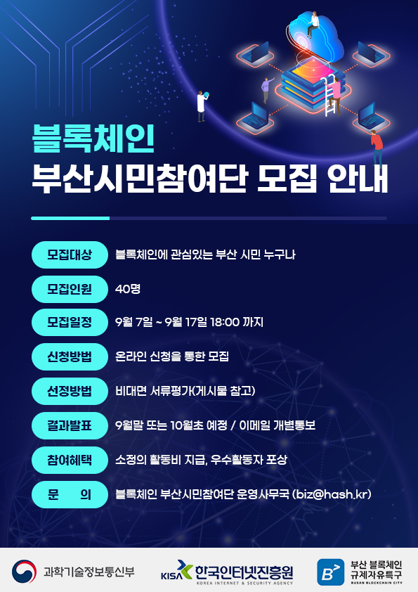 [테크월드뉴스=조명의 기자] 한국인터넷진흥원(이하 KISA)은 과학기술정보통신부와 2021년 블록체인 특구연계사업에 대한 부산 시민 의견을 공유·수렴하기 위해 ‘블록체인 부산시민참여단’을 모집한다고 밝혔다.