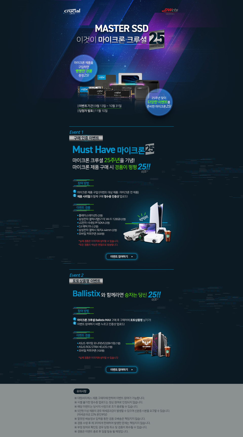 이번 프로모션은 대원씨티에스가 유통하는 마이크론 크루셜 전 제품을 대상으로 구매 인증과 포토 상품평 등 2가지 형태로 진행된다. 추첨을 통해 약 680여 명의 참여자에게 플레이스테이션5, 삼성 갤럭시탭S7, LG 시네빔, DJI 매빅 미니2, 에이수스 게이밍 모니터, 에이수스 ROG PC 케이스, 삼성 갤럭시워치4 등 총 1000만 원 규모의 다양한 경품을 증정한다. 9월 13일부터 10월 31일까지 진행되며, 당첨자 발표일은 11월 10일이다.
