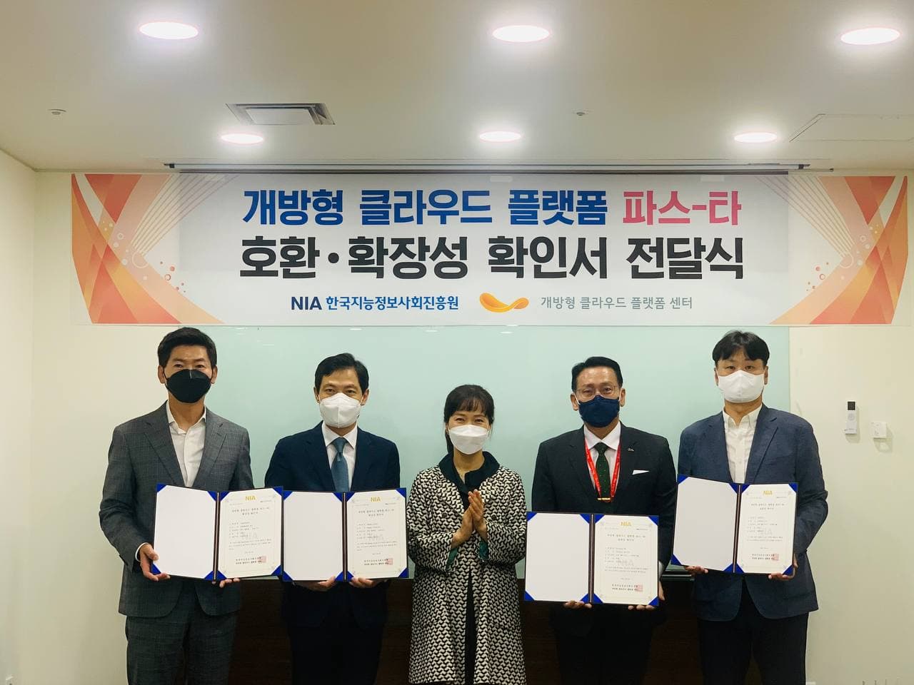 [테크월드뉴스=조명의 기자] 한국지능정보사회진흥원(이하 NIA)은 9월 15일 개방형 클라우드 플랫폼 센터에서 개방형 클라우드 플랫폼 파스-타 호환·확장성 확인서 전달식을 가졌다고 밝혔다.