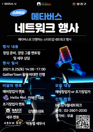 [테크월드뉴스=조명의 기자] 서울 양천구는 9월 25일 예비창업자를 대상으로 요즘 각계에서 뜨거운 주목을 받고 있는 메타버스 플랫폼을 활용한 ‘창업 네트워킹 데이’를 개최한다고 밝혔다.