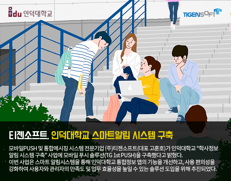 [테크월드뉴스=조명의 기자] 티젠소프트가 인덕대학교 학사정보 알림 시스템 구축 사업에 ‘모바일 푸시 솔루션(TG 1st PUSH)’을 구축했다고 밝혔다.