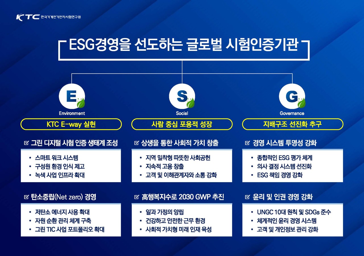 KTC는 ESG 경영 추진을 위해 지난 7월 국내 시험·인증기관 최초로 전담조직인 ‘ESG 경영추진단’을 신설해 약 3개월간 중·장기적 계획을 준비해왔다고 밝혔다.