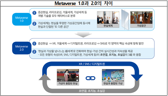 특히 메타버스 2.0을 다양한 속성(XR·SNS·가상세계)이 초연결, 초지능, 초실감으로 융합돼 ‘현실과 가상을 넘나드는 초세계’로 정의했다.
