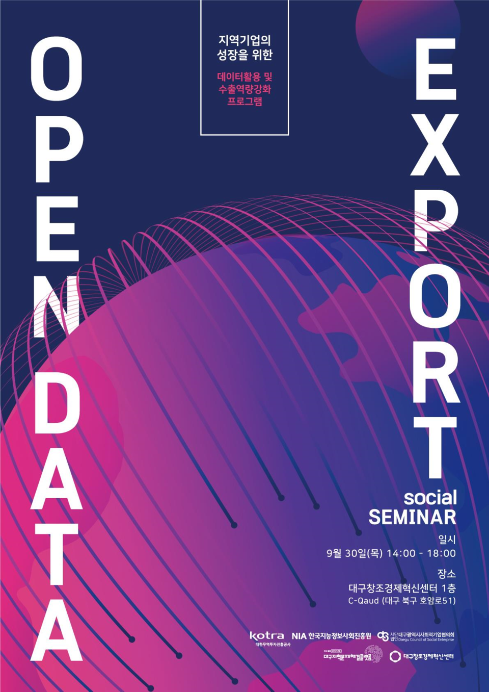 설명회에서는 해외수출·해외 사회적기업 성공사례, KOTRA 빅데이터 플랫폼 활용방안 교육, 국내외 공공데이터의 이해, 공공데이터의 해석·사업기획에 적합한 공공데이터 탐색 방법 등 지역 사회적기업, 소셜벤처의 데이터 역량 강화를 위한 교육세미나를 진행했다.