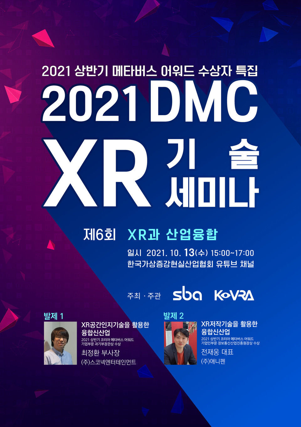 이번 10월 세미나는 올 6월 실시된 ‘2021 상반기 코리아 메타버스 어워드’에서 기업 부문 과학기술정보통신부 장관상을 받은 스코넥엔터테인먼트 최정환 부사장, 기업인 부문에서 정보통신진흥원장상을 수상한 애니펜 전재웅 대표를 연사로 초청해 진행한다.