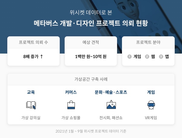 위시켓 데이터에 따르면, 2021년 9월까지 위시켓에 등록된 메타버스 관련 IT 외주 프로젝트의 유형은 캐릭터 의상 3D 모델링, 메타버스 내의 가상공간 구축, 메타버스 플랫폼의 직접 개발 등이 있었고, 의뢰 금액은 100만 원 부터 10억 원까지 고르게 분포된 것으로 나타났다.