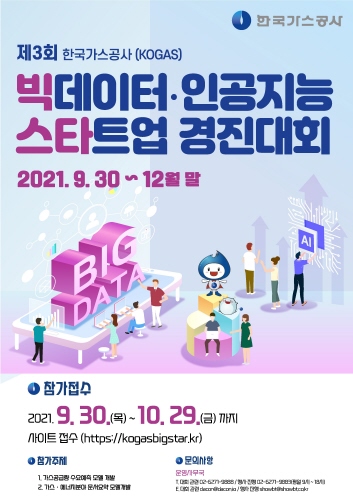 [테크월드뉴스=조명의 기자] 한국가스공사(이하 가스공사)는 10월 11일부터 12월 10일까지 세 달간 ‘2021년 제3회 빅데이터·인공지능 스타트업 경진대회’를 개최한다고 밝혔다.
