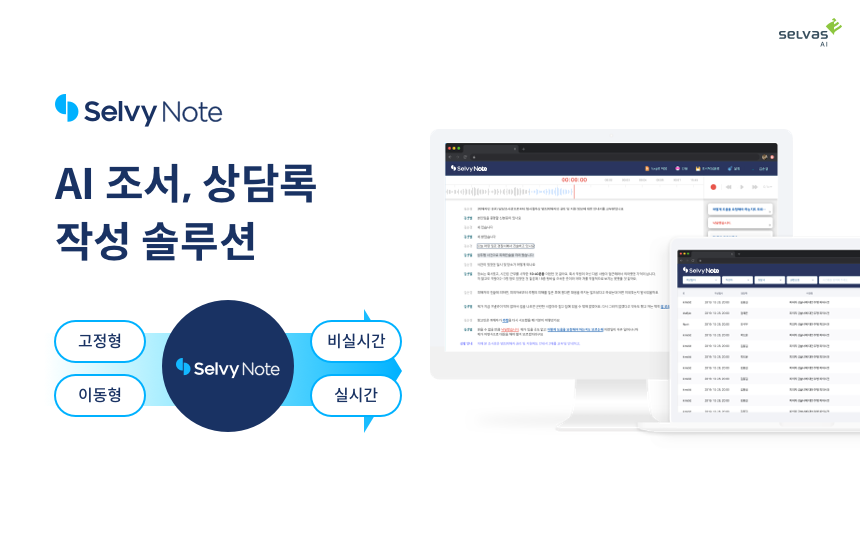 한편, 셀바스 AI는 조서·상담록 작성 솔루션 제품명을 ‘스테노 셀비(Steno Selvy)’에서 셀비 노트(Selvy Note)로 변경하고 다양한 분야로 적용을 확대 중이다.