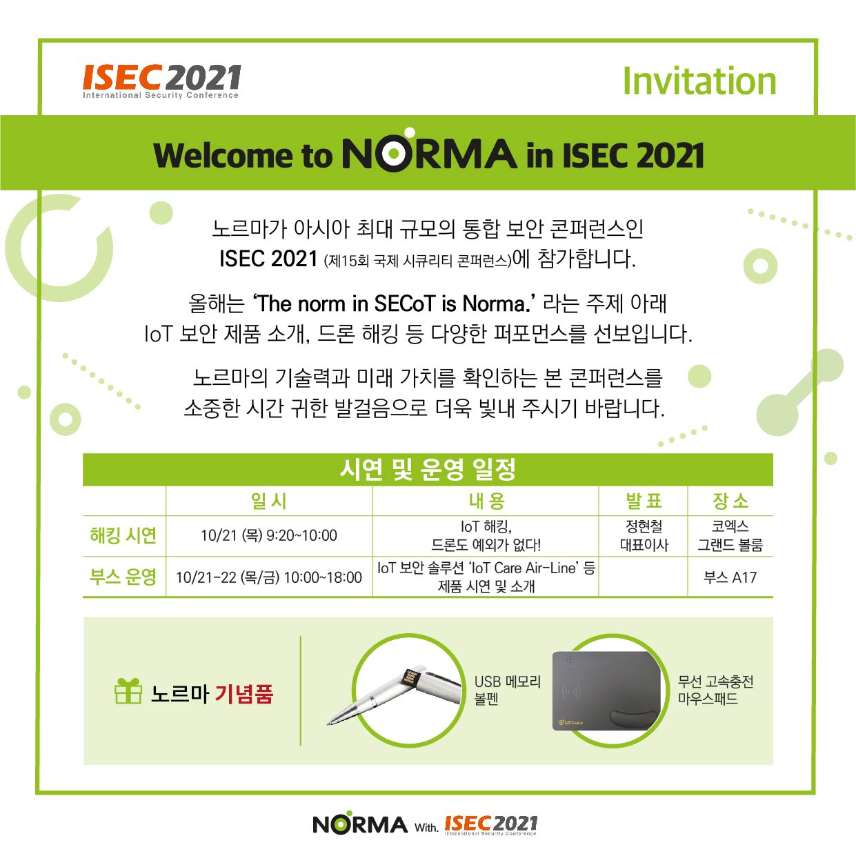 [테크월드뉴스=조명의 기자] 노르마가 오는 10월 21일부터 22일까지 서울 코엑스에서 열리는 아시아 최대 통합 보안 컨퍼런스 ‘제15회 국제 시큐리티 콘퍼런스(ISEC 2021)’에 참가한다.