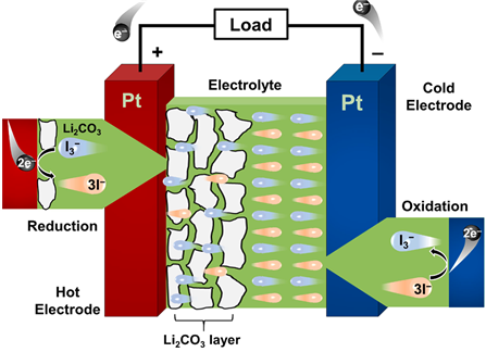 이에 연구팀은 N형 열전지의 성능을 높이기 위해 농도차 전지가 결합된 하이브리드 열전지를 고안했다. 농도차 전지가 결합된 하이브리드 열전지는 고온부에서만 요오드 이온이 소모되므로 고온부-저온부의 요오드 이온의 농도차이가 발생하는데, 이 농도차는 형성된 탄산 리튬층에 의해 장시간 유지되면서 추가 기전력을 생산하게 된다.