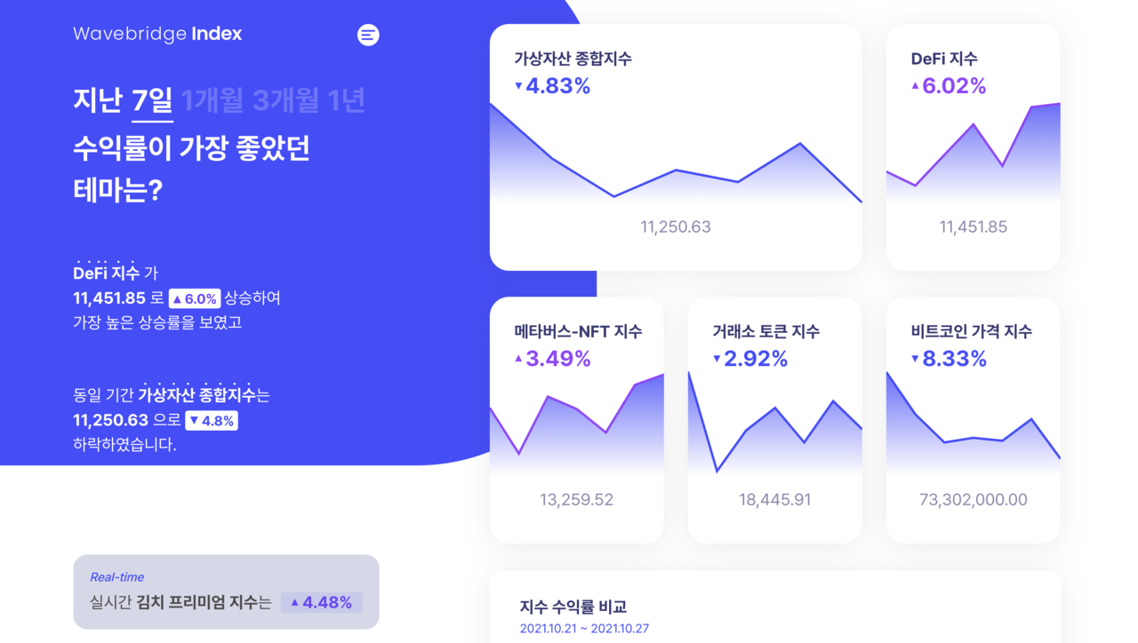 이번 지수 공개에 대해 웨이브릿지 오종욱 CEO는 “급변하는 가상자산 시장의 동향을 모든 투자자가 웨이브릿지의 인덱스를 통해 쉽게 파악할 수 있도록 돕고 싶다”며 “웨이브릿지는 앞으로도 다양한 가상자산 지수를 발표하고, 투자상품을 개발하는 등 대중들이 안전하고 쉬운 투자를 할 수 있도록 노력하겠다”고 말했다.