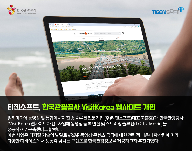 [테크월드뉴스=조명의 기자] 티젠소프트가 한국관광공사 VisitKorea 웹사이트 개편 사업에 동영상 등록 변환·스트리밍 솔루션(TG 1st Movie)을 성공적으로 구축했다고 밝혔다.