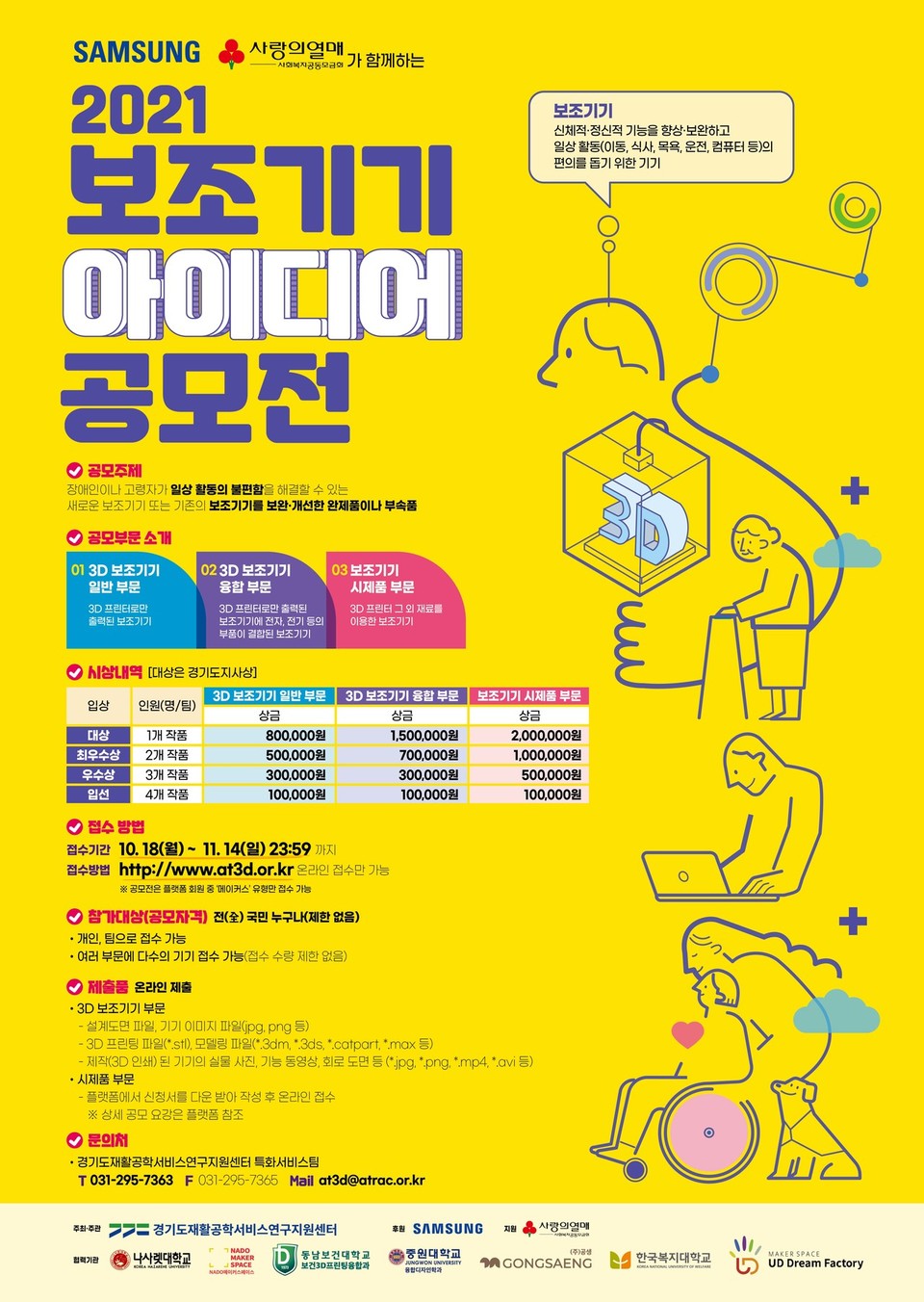 2021년 공모전은 센터가 그간 진행해온 보조기기 아이디어 공모전과 센터가 진행 중인 나눔과꿈 공모 사업(장애인을 위한 3D 프린터·신소재를 활용한 맞춤 보조기기 제작 플랫폼 구축·지원사업)이 결합된 형태로 ‘보조기기 시제품 부문’과 3D 프린터로 출력한 ‘3D 보조기기 일반 부문’, 전자·전기 등의 부품을 결합한 ‘3D 보조기기 융합부문’ 등 3가지 부문으로 나눠 진행된다.
