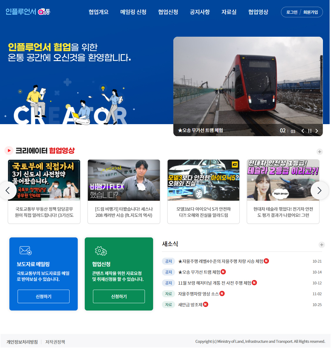국토교통부(이하 국토부)는 유튜버 등 SNS 인플루언서 콘텐츠 제작 지원과 정책소통 활성화를 위해 11월 5일부터 ‘인플루언서 온통’ 누리집 시범 운영을 시작한다.