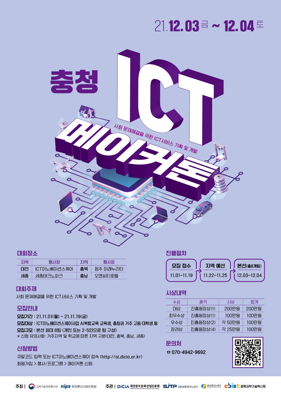 충청 ICT 메이커톤 대회는 ICT 이노베이션 스퀘어 확산 사업의 하나로 과학기술정보통신부와 정보통신산업진흥원이 주최하고 대전정보문화산업진흥원, 세종테크노파크, 충북과학기술혁신원, 충남테크노파크가 공동 주관한다.