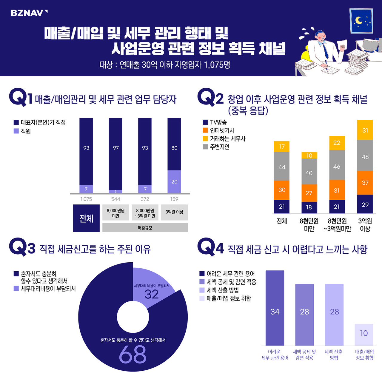 중소사업자를 위한 무료 경영관리 핀테크 서비스 비즈넵은 리서치 전문 기업 엠브레인과 함께 연매출 30억 원 이하의 자영업자 1075명을 대상으로 ‘매출, 매입·세무 관리 행태’, ‘사업운영 관련 정보 획득 채널’에 관련된 설문 조사를 진행했다.