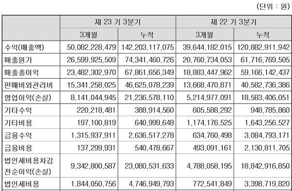 영업이익은 전년 동기 대비 56.1% 늘어난 81억4104만원으로 집계됐다. 당기순이익은 전년 동기 대비 86.7% 급증한 74억9875만원이었다.
