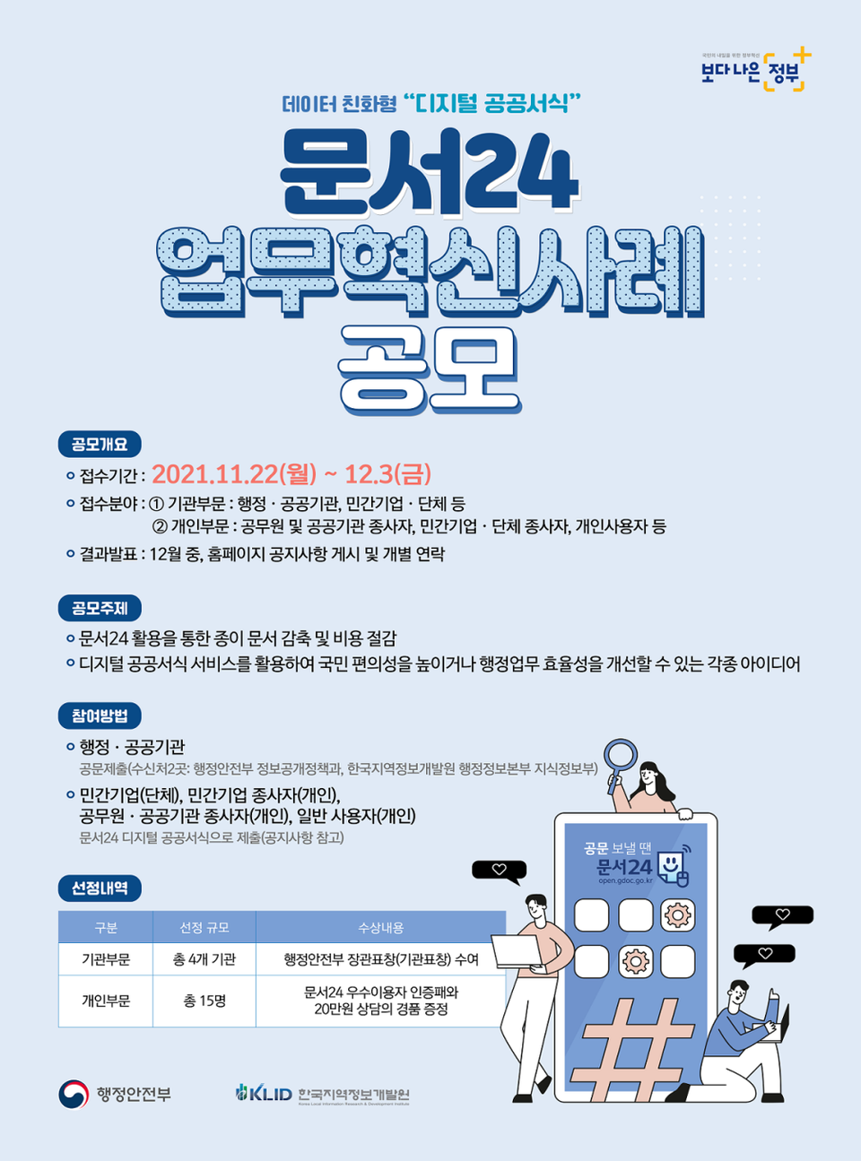 수상은 기관부문의 경우 우수작 4점을 선정해 행안부 장관상을 수여하고, 개인부문은 당선작 15점을 선정해 우수이용자 인증패와 20만 원 상당의 경품을 증정한다.