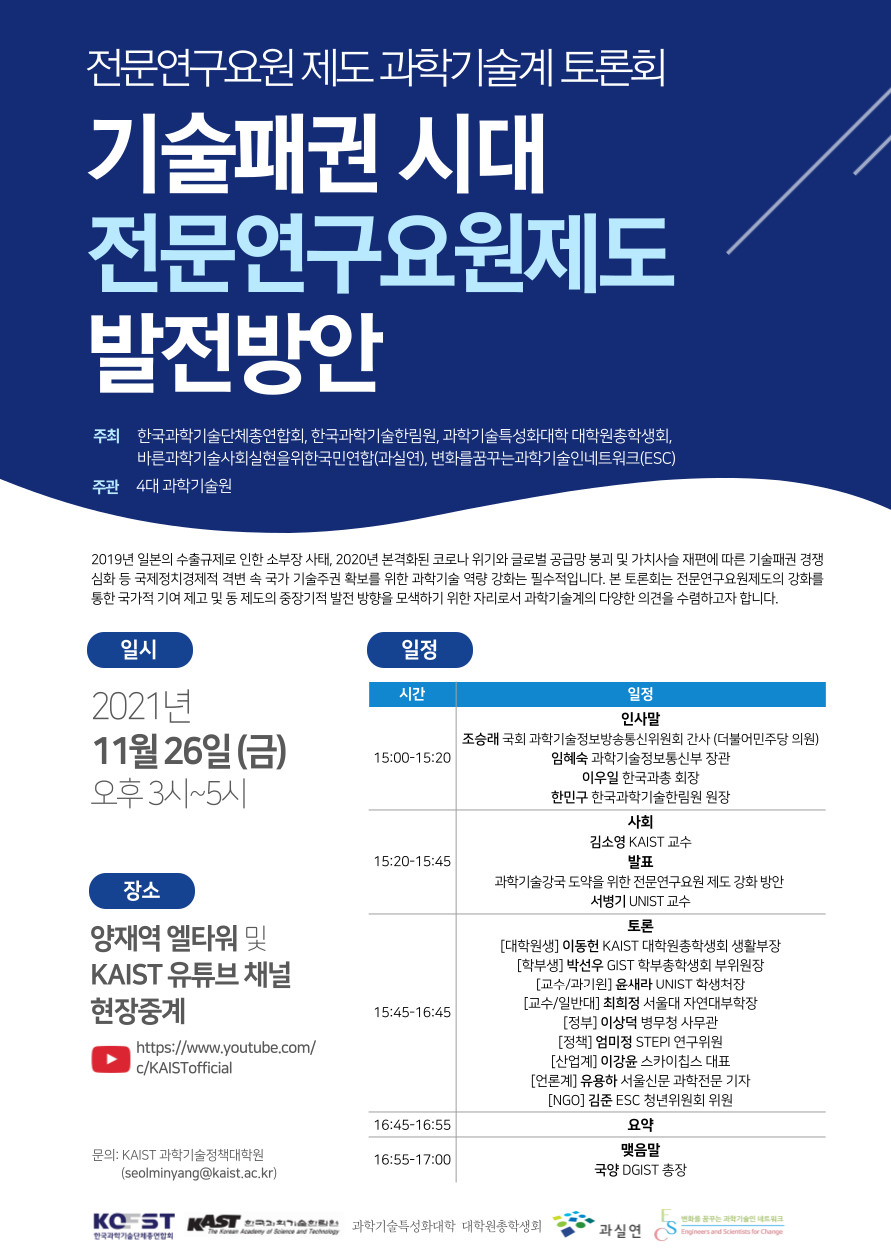 ‘기술패권 시대 전문연구요원제도 발전방안’이라는 제목으로 추진된 이번 토론회는 4대 과학기술원이 주관하고, 한국과학기술단체총연합회(한국과총), 한국과학기술한림원(한림원), 과학기술특성화대학 대학원총학생회, 바른과학기술사회실현을위한국민연합(과실연), 변화를꿈꾸는과학기술인네트워크(ESC) 등 과학기술계 주요 단체가 공동 주최자로 나섰다.