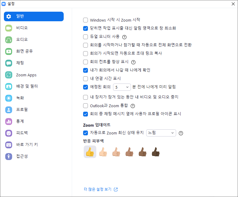 회의용 줌 클라이언트 최신 버전(버전 5.8.6)을 다운로드 해 설치하면 설치 성공 안내와 함께 자동 업데이트 상태 유지 여부를 선택할 수 있는 창이 뜬다. 이후 줌 클라이언트 설정에서 일반 항목 중 ‘자동으로 줌 최신 상태 유지’ 체크박스를 선택 또는 해제함으로써 자동 업데이트 기능을 활성화 또는 비활성화할 수 있다.