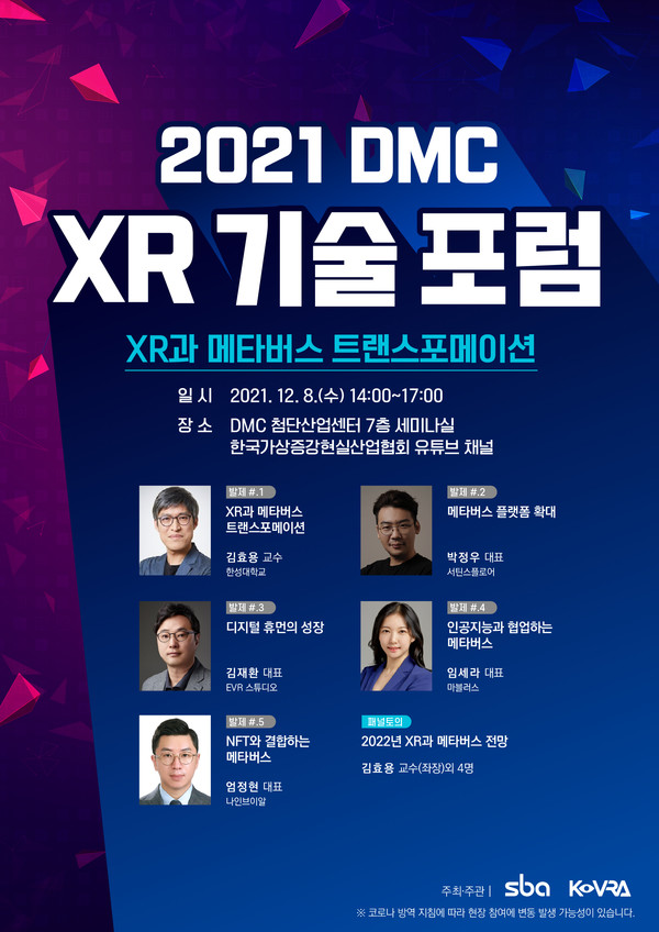 [테크월드뉴스=조명의 기자] 서울산업진흥원(SBA), 한국가상증강현실산업협회(KoVRA)가 함께 주최하는 ‘2021 DMC XR 기술 포럼’이 12월 8일 상암동 DMC 첨단산업센터 7층 세미나실에서 열린다.