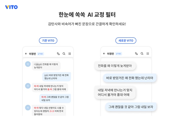 문자변환 AI 교정은 전화로 대화를 나눌 때 자연스레 나오는 감탄사와 중복어를 포함해 비속어가 제외된 상태의 문자 변환 내용을 보여주는 기능으로, 이번 업데이트를 통해 비토의 수준 높은 AI 전화 서비스를 보다 가독성 높고 쾌적하게 이용할 수 있게 됐다.